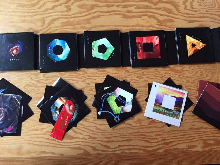 What you get is a box set which looks, from the design, like you’re about to get a 5-disc compilation. You don’t. You get one disc and a whole range of other goodies. In keeping with the eclectic and holistic themes of the concept, each section represents a different element (Earth, Air, Fire etc.) and a different sensation (touch, look, taste etc.). In my copy the packaging isn’t perfect – Touch and Feel seem much the same to me and back of the package says Smell instead of Touch – but nonetheless, the idea is great. In each box section you receive ‘goodies’ in keeping with the senses. I loved the one for Touch which was a very nice bracelet and the one for Taste which included a mango bar (which was tasty!).