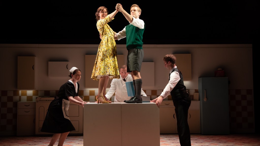 A stroke of genius, considering this is the story of a well-known food writer, is to involve the audience with the tastes and smells of the culinary world. We are offered sweets of various sorts along the way and smell the cooking on stage. Ironically, the opening performance was delayed a little as, quite literally, someone had burnt the toast just before the start and staff had clearly made valiant attempts to clear the fumes. I almost wonder if it was planned as it fitted perfectly with the opening scenes. Wasn’t everyone’s day started with the smell and taste of burnt toast back in those days?