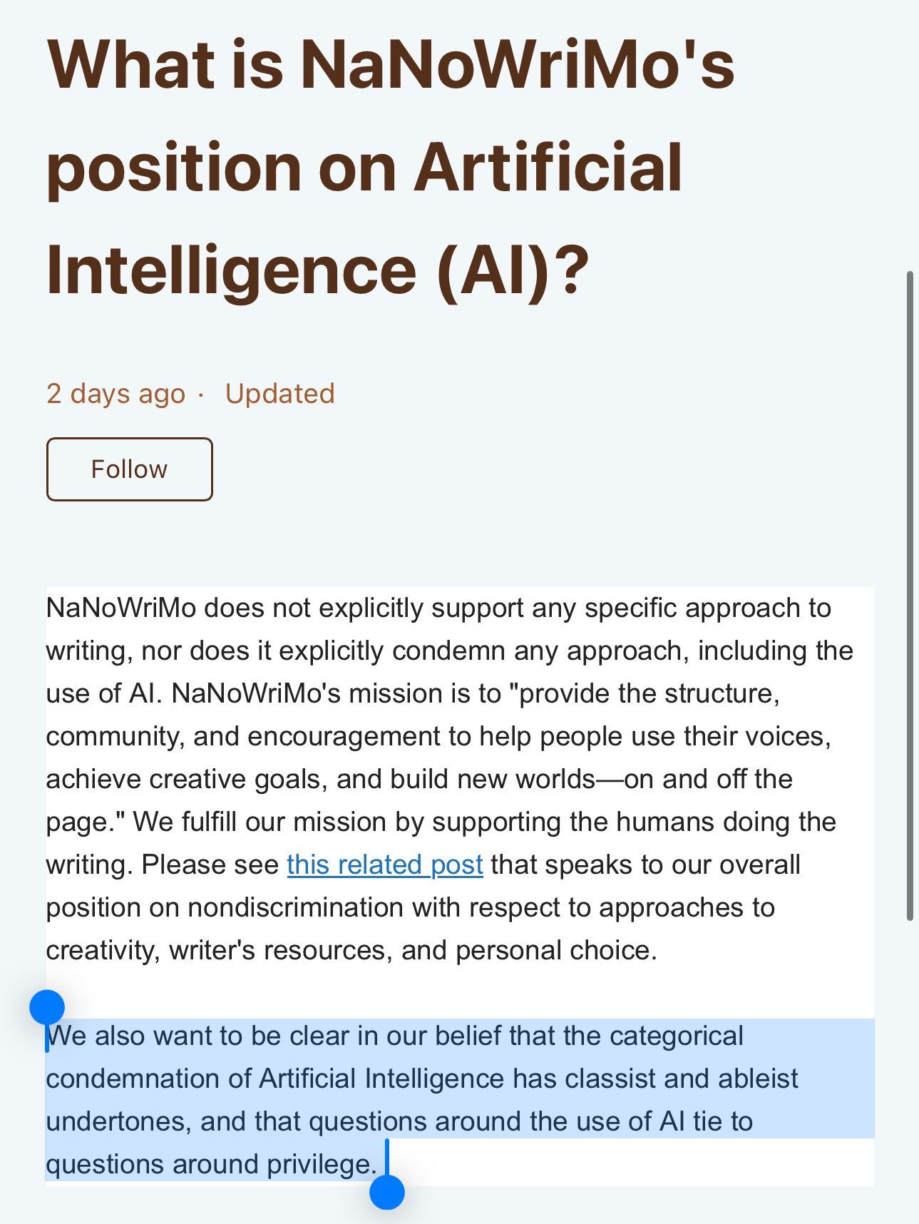 NaNo are quite right to say that banning a tool is ableist and classist. For some people, using AI is a godsend. For myself, I’d love to use it but I can’t figure out how to make it do anything for me. Every time I try ChatGPT or similar, it comes up with, at best, the same a Google search would give me and, at worst, utter gibberish. But for others who know how to use it (and are probably much younger than me!) it can help those who would otherwise struggle to write anything at all.